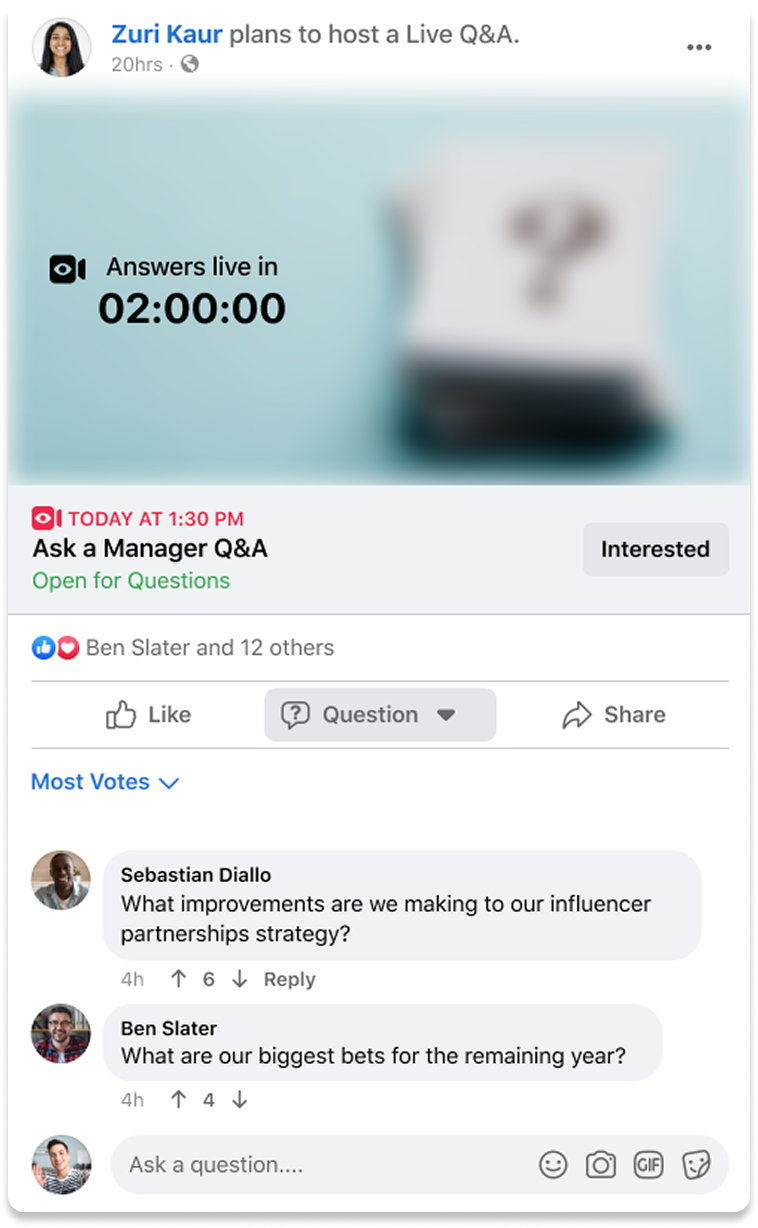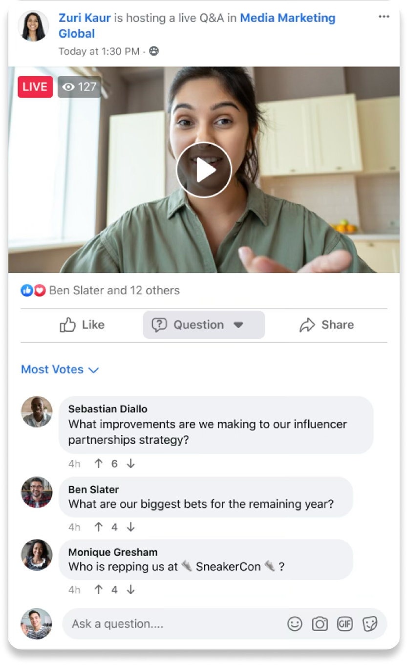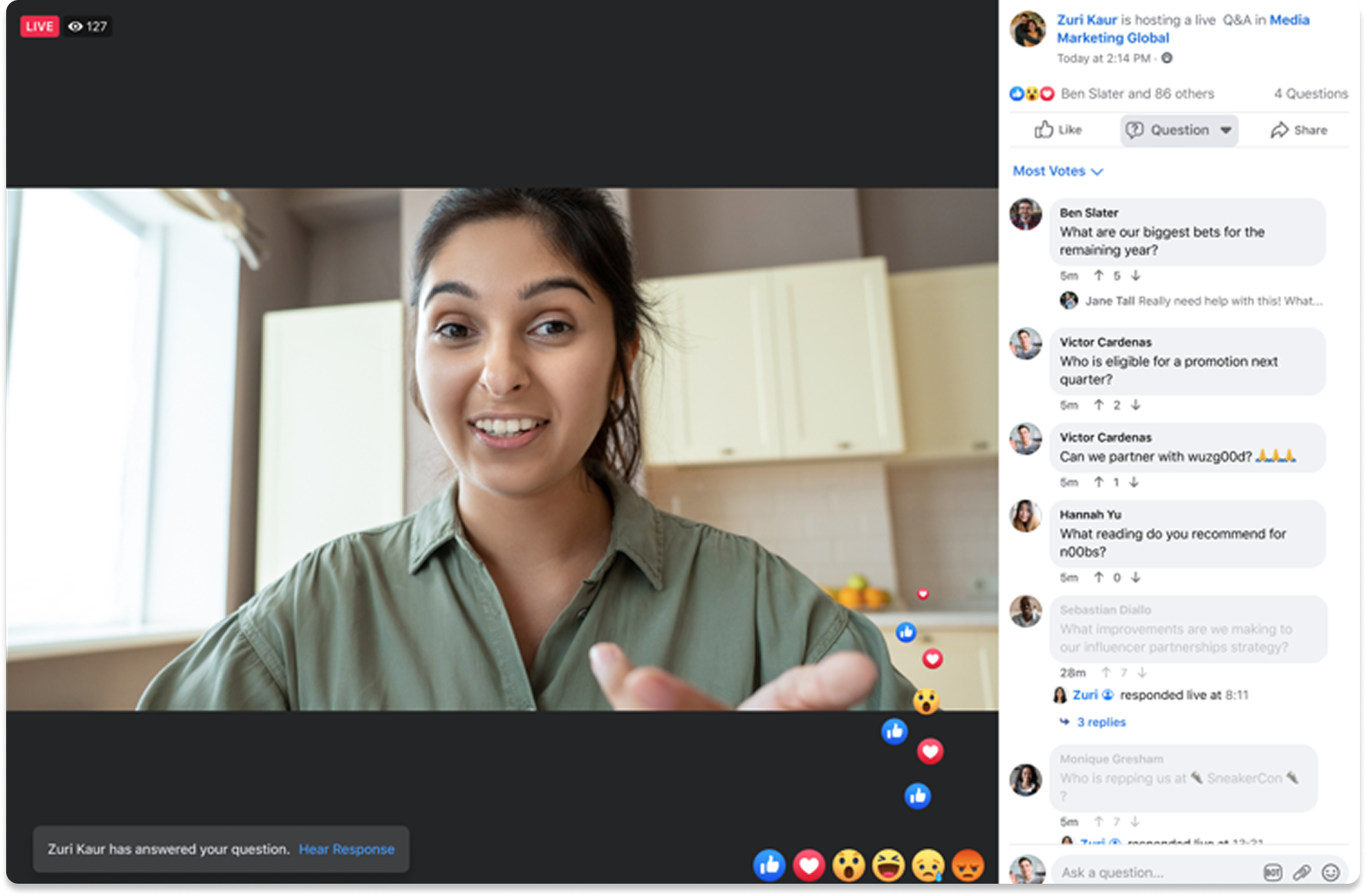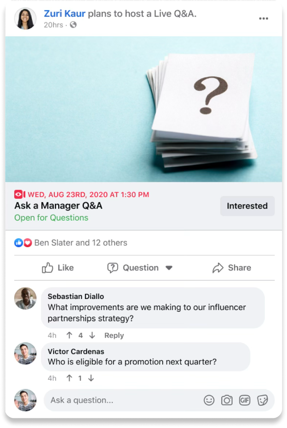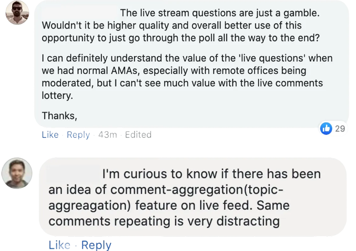 On Fridays, Mark would host a company-wide Q&A session where employees had the opportunity to ask him anything. Before the video went live (pre-live), admins relied on Feed posts to collect questions for Q&A sessions. At a company of our scale, thousands of people would ask questions but only few were selected to be answered.āØāØ