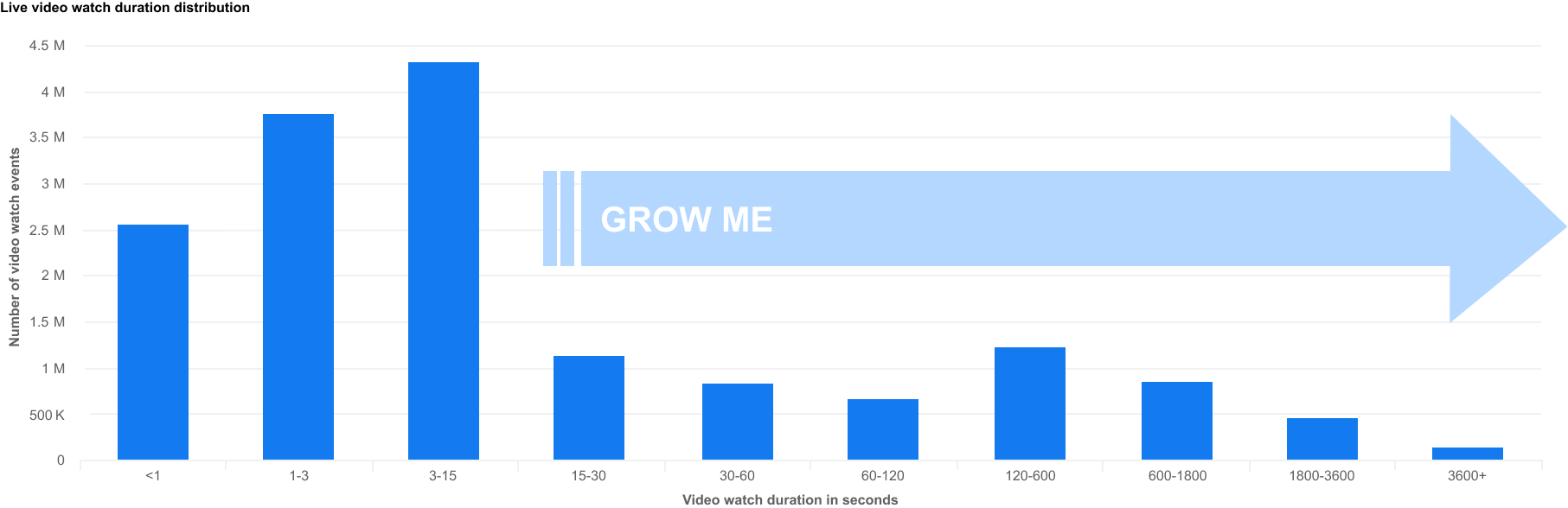 At the same time, the business was analyzing Live video consumption behavior. The average video on Live on Workplace was just around 5 minutes, with the median watch time being ~21 seconds. Crafting a deeper insights knowledge base would help us understand why the median watch time for these videos was so short, and what was stopping users from meaningfully watching a Live.