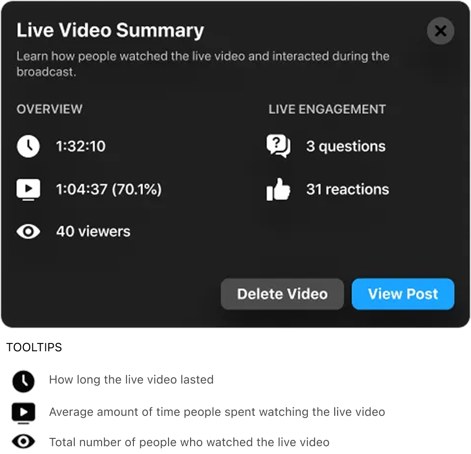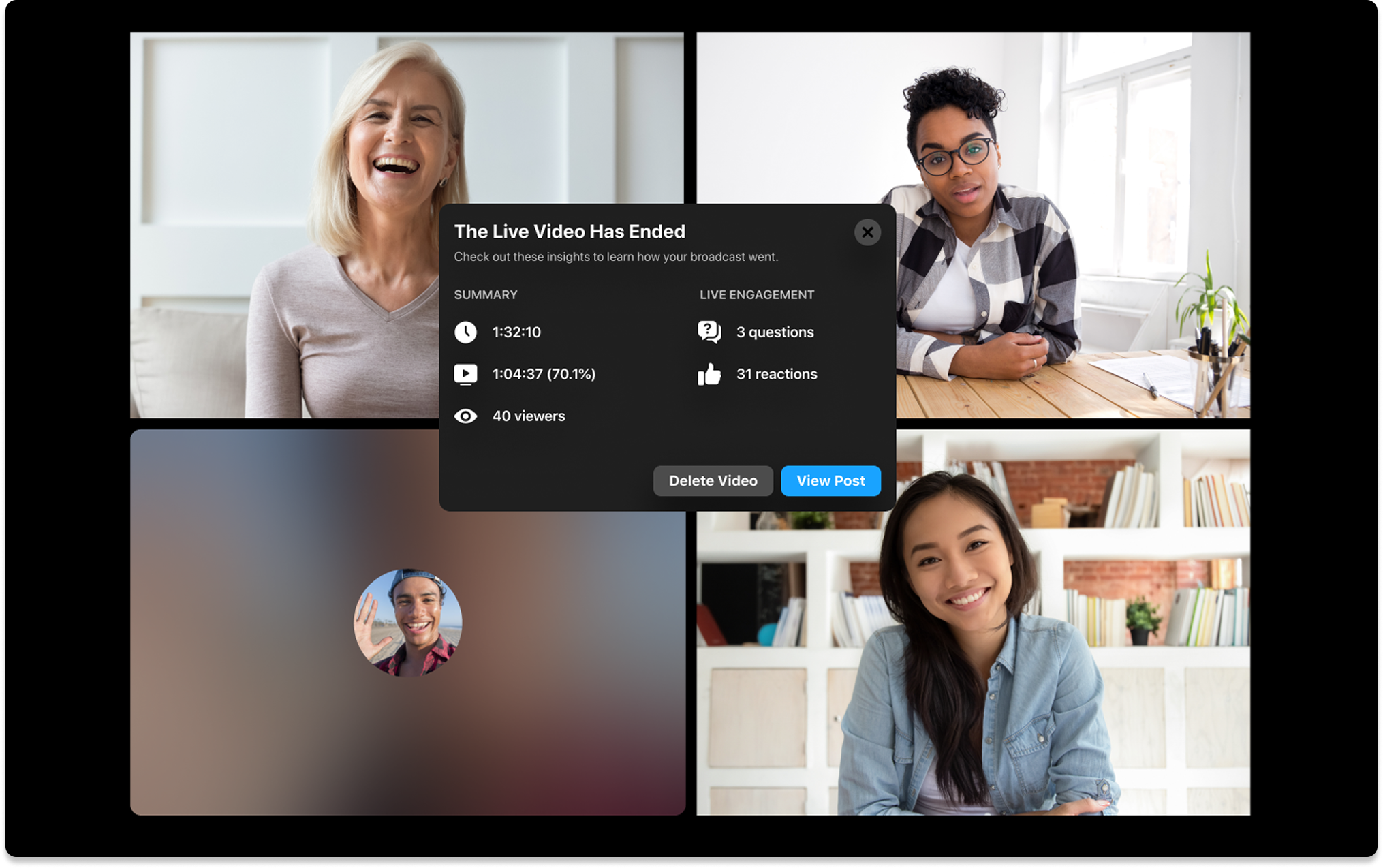 Workplace was often used as part of a suite of tools due to its limitations. Without analytics we found that admins were moving away from our video offering altogether, instead integrating into our platform with other services like BlueJeans, Webex, and Zoom. It became an urgent business need for our team to ship an analytics solution quickly; we took the most requested metrics and displayed them in a dialog immediately after the live video ended and was posted.