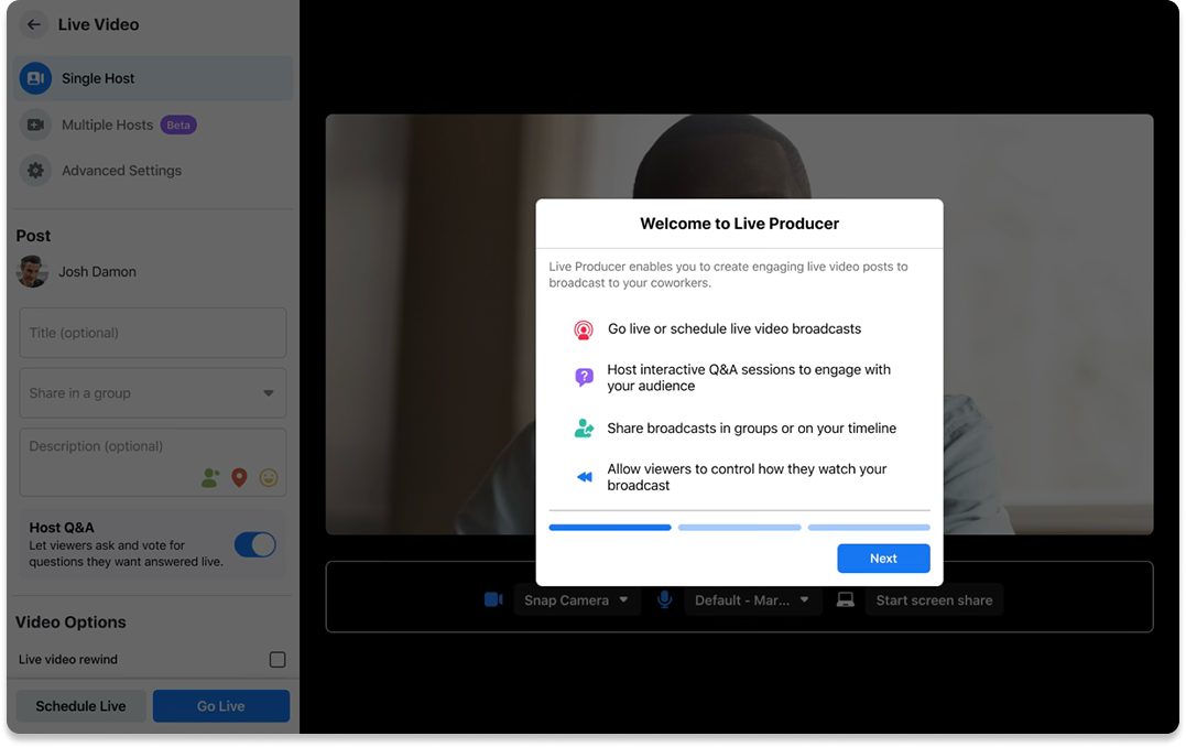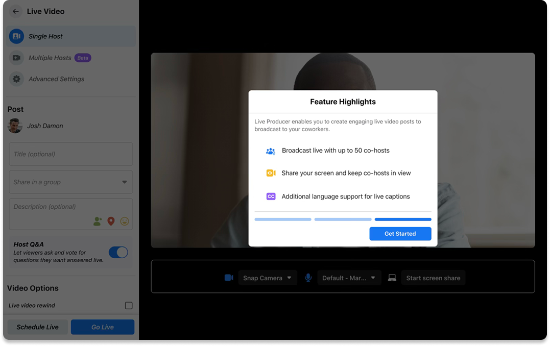 Live Producer was a legacy Facebook feature, and was buggy and over-complex. 19% of interviewed hosts dropped off at this step and did not go live, as they were overwhelmed and unsure of available features.