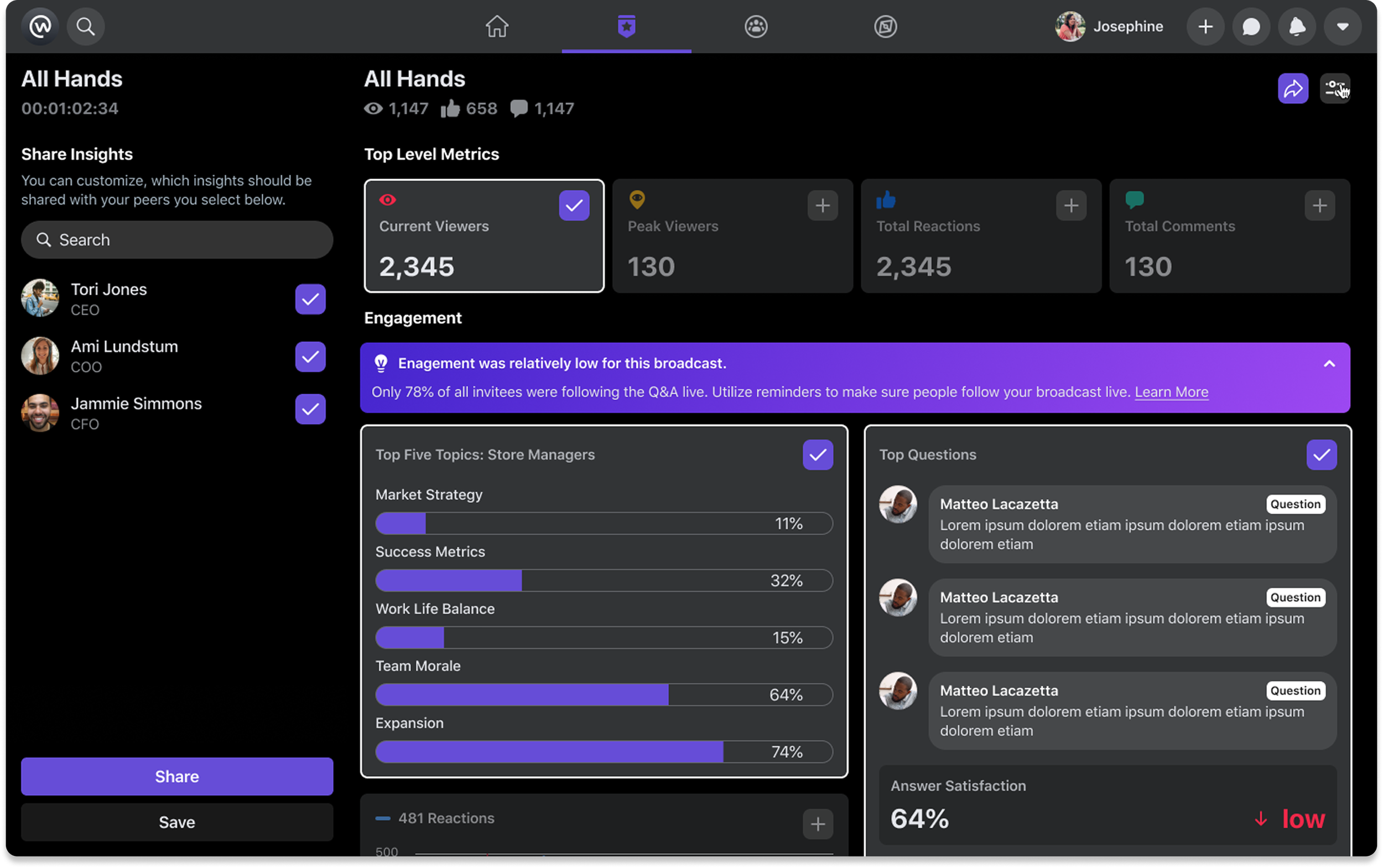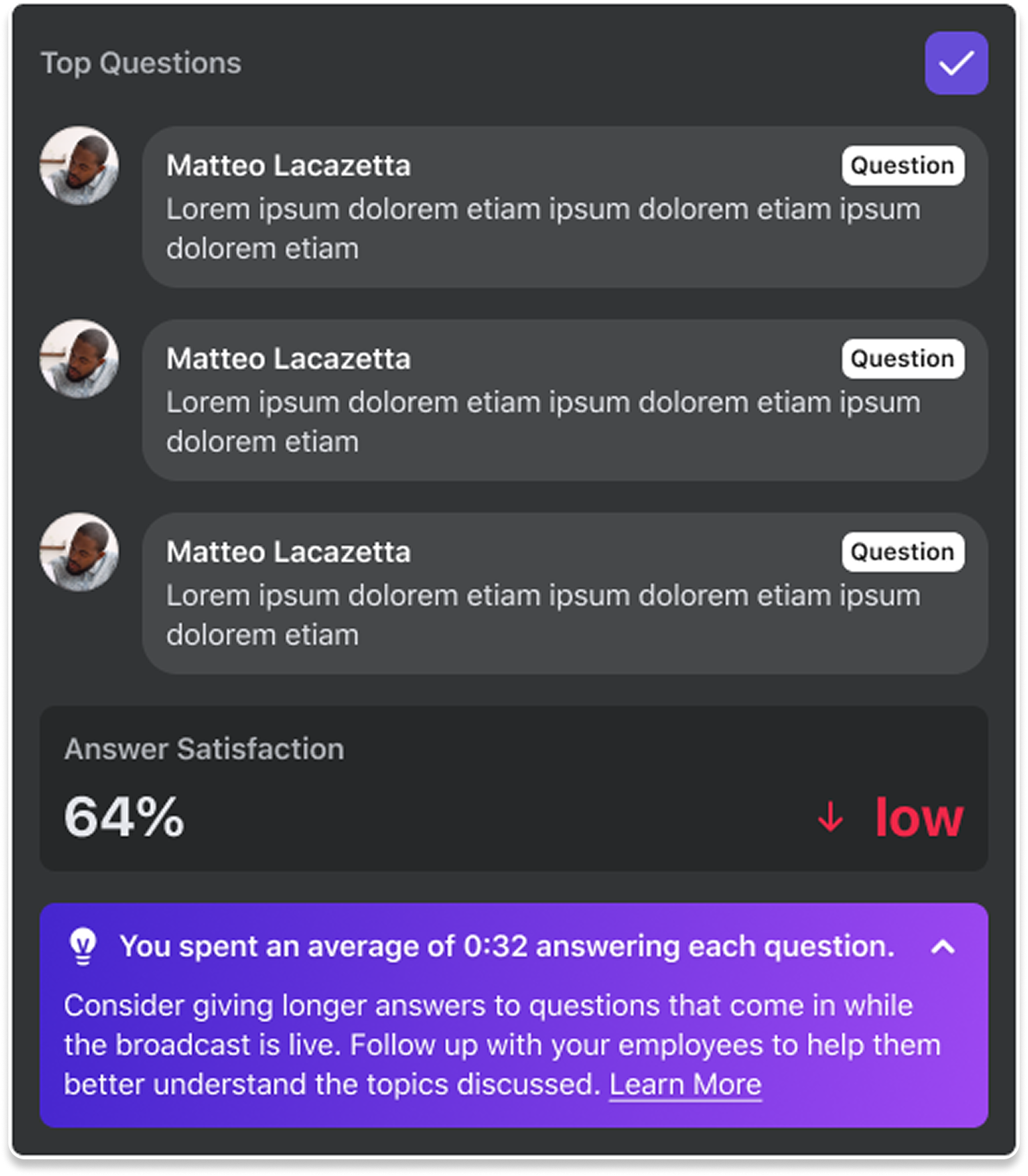 One of the major pain points we found for hosts and moderators was in building excitement amongst employees pre-live. Moderators with advanced technical proficiency were creating graphics and short animations for viewers to enjoy as they waited for Q&As to begin.