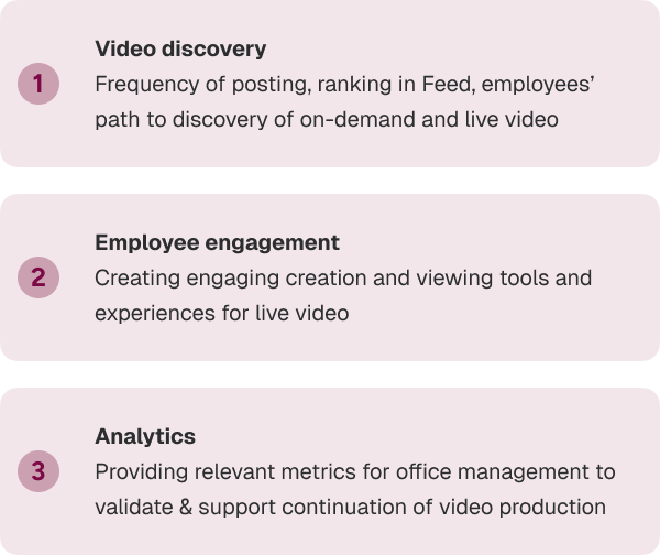 A repeated theme from research was the desire for employees to move from a passive live video consumption state to a more active video experience. There were a number of tools and plugins that could be used with live for both creators and employees, but the creation and viewing experiences behind them were severely broken.