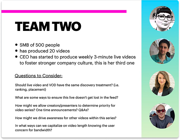 I collaborated wth research to appropriately split the group of 8 into two teams, developing scenarios based on company size and broadcast proficiency.