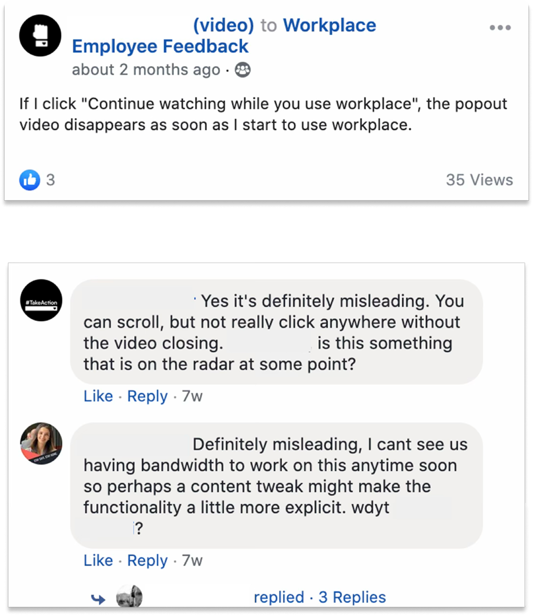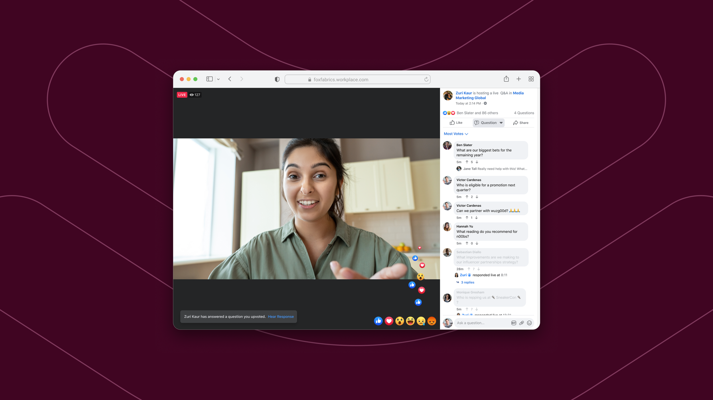 On Workplace, we found that live video posts were among the top drivers of engagement. Like on our other platforms, viewers had a lot of questions for the creators but those questions were either buried in threads on more popular videos or quickly lost in ephemeral comment ranking patterns. As a team we aligned to first tackle addressing the Q&A experience on Workplace live video.